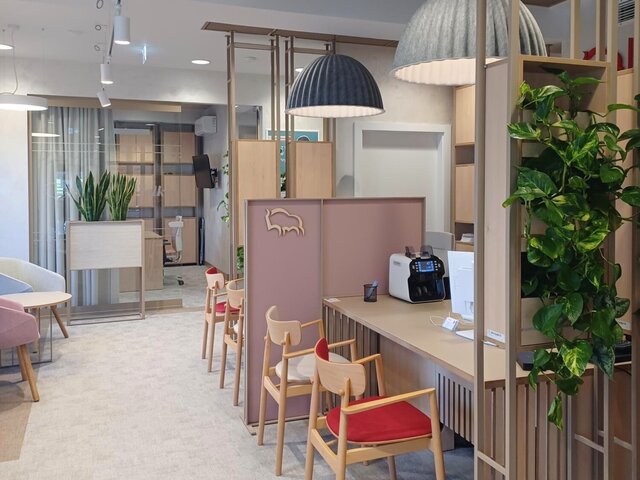 Nowa przestrzeń oferuje stanowiska i pokoje do obsługi klientów oraz strefę samoobsługową umożliwiającą szybkie oraz samodzielne realizowanie codziennych operacji bankowych. Do dyspozycji klientów są także bankomaty, dostępne przez całą dobę. Wnętrze oddziału zostało urządzone zgodnie ze standardami bankowymi, w spójnej i eleganckiej stylistyce, która podkreśla profesjonalny charakter placówki.